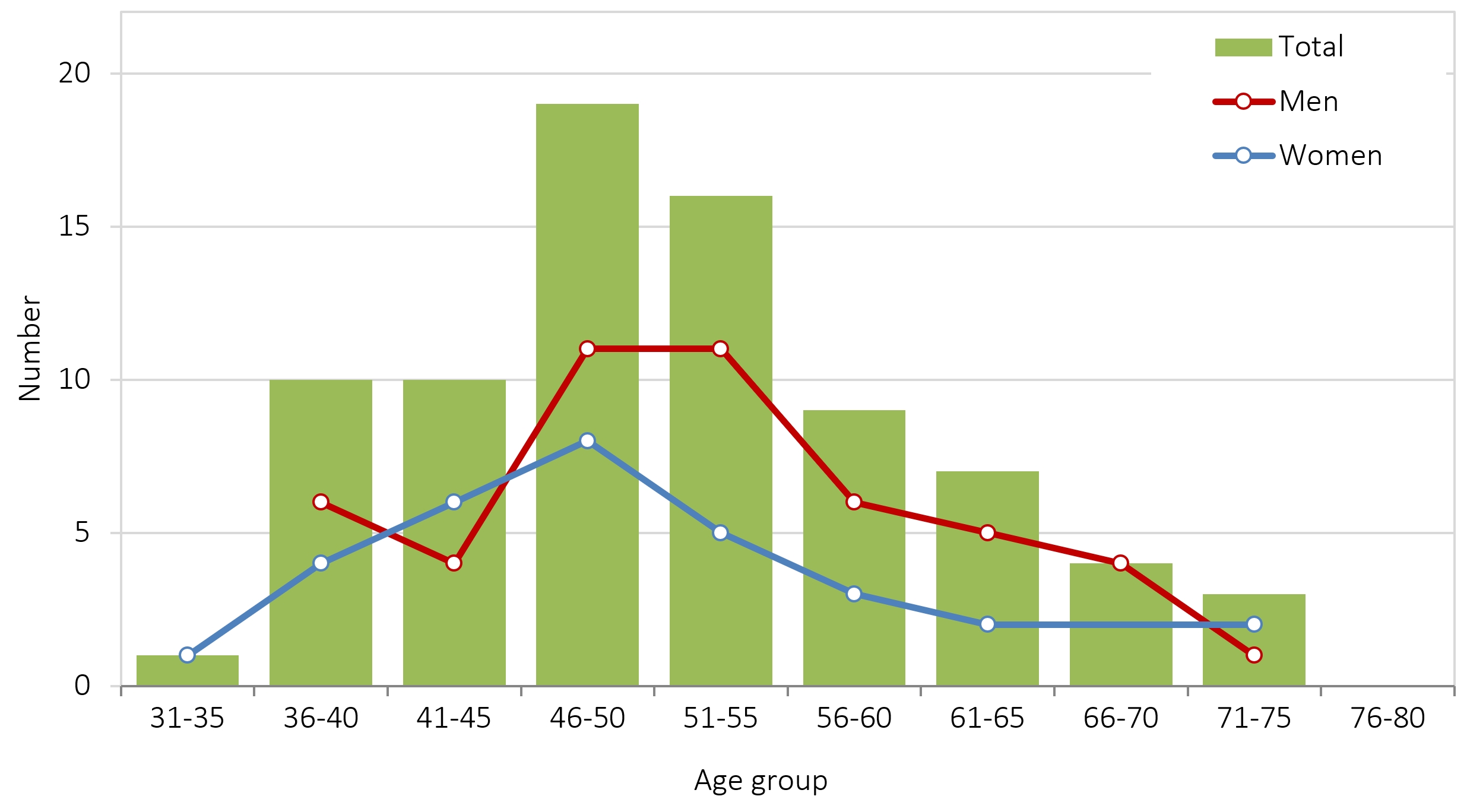 The youngest male applicative project leader is 36 years old and the youngest female leader is 35. The oldest male applicative project leader is 72 years old and the oldest female leader is 74.