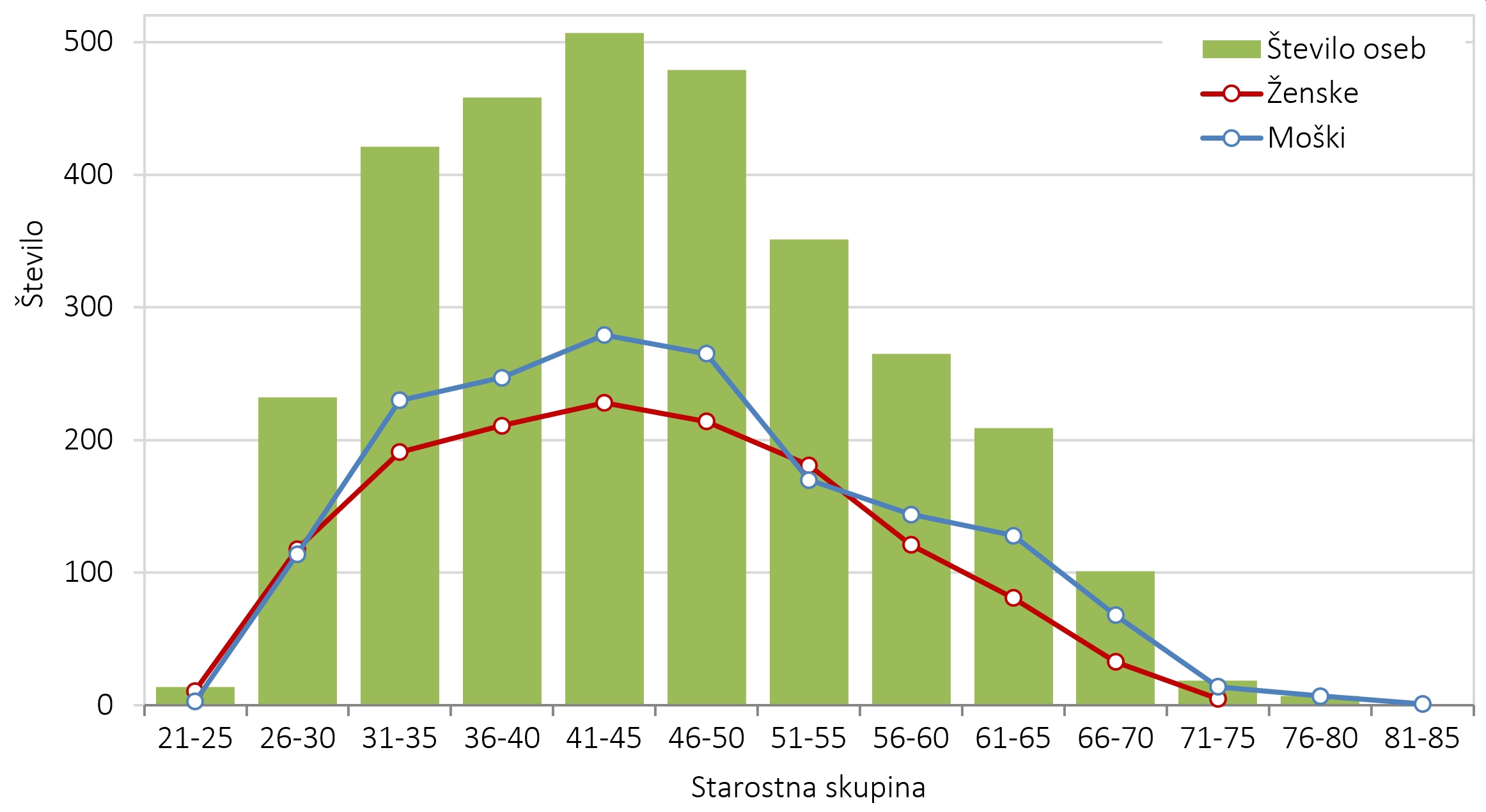 Raziskovalke in raziskovalci, ki so izvajali temeljne projekte, glede na starost in spol v letu 2024