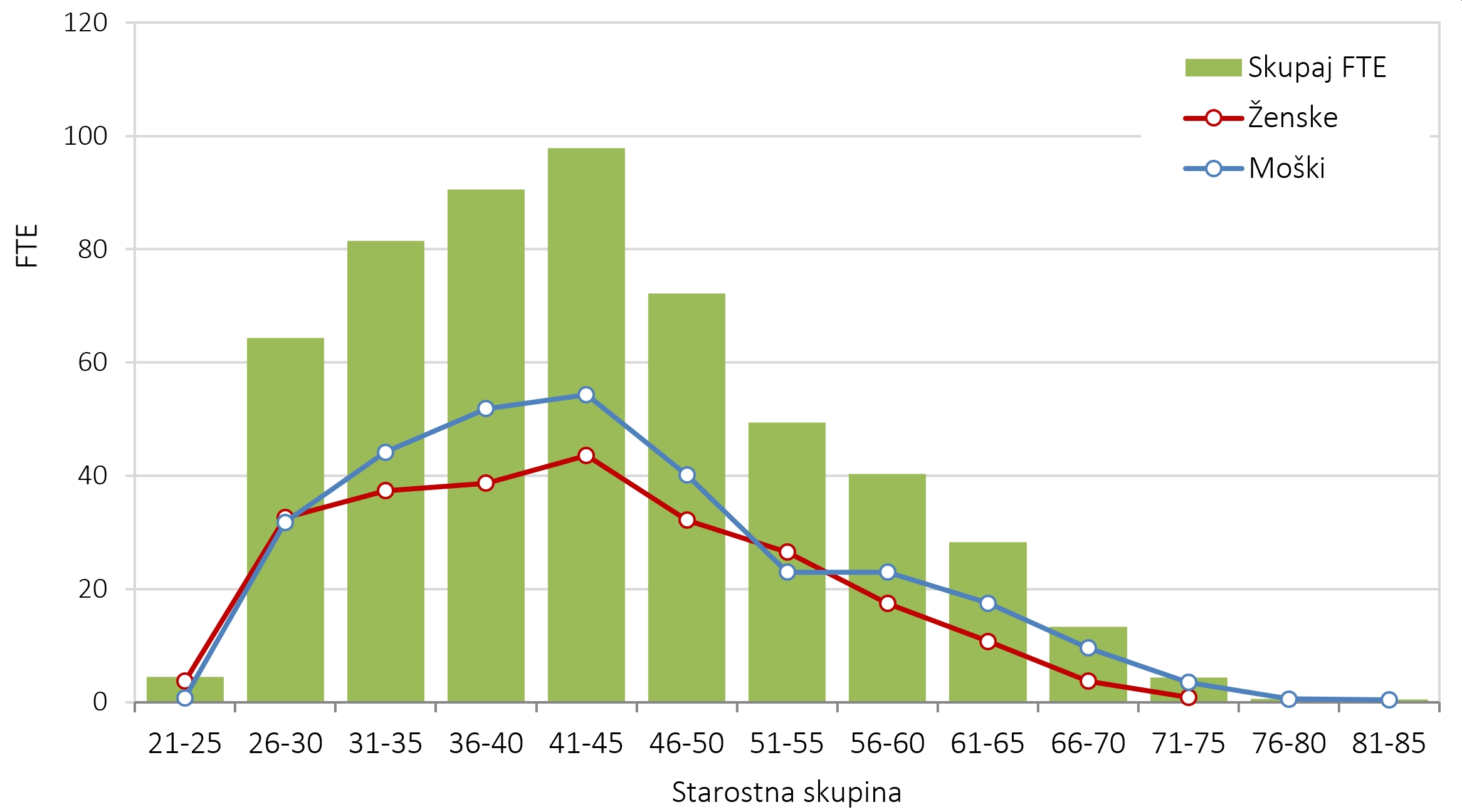 FTE glede na starost in spol za temeljne projekte v letu 2024