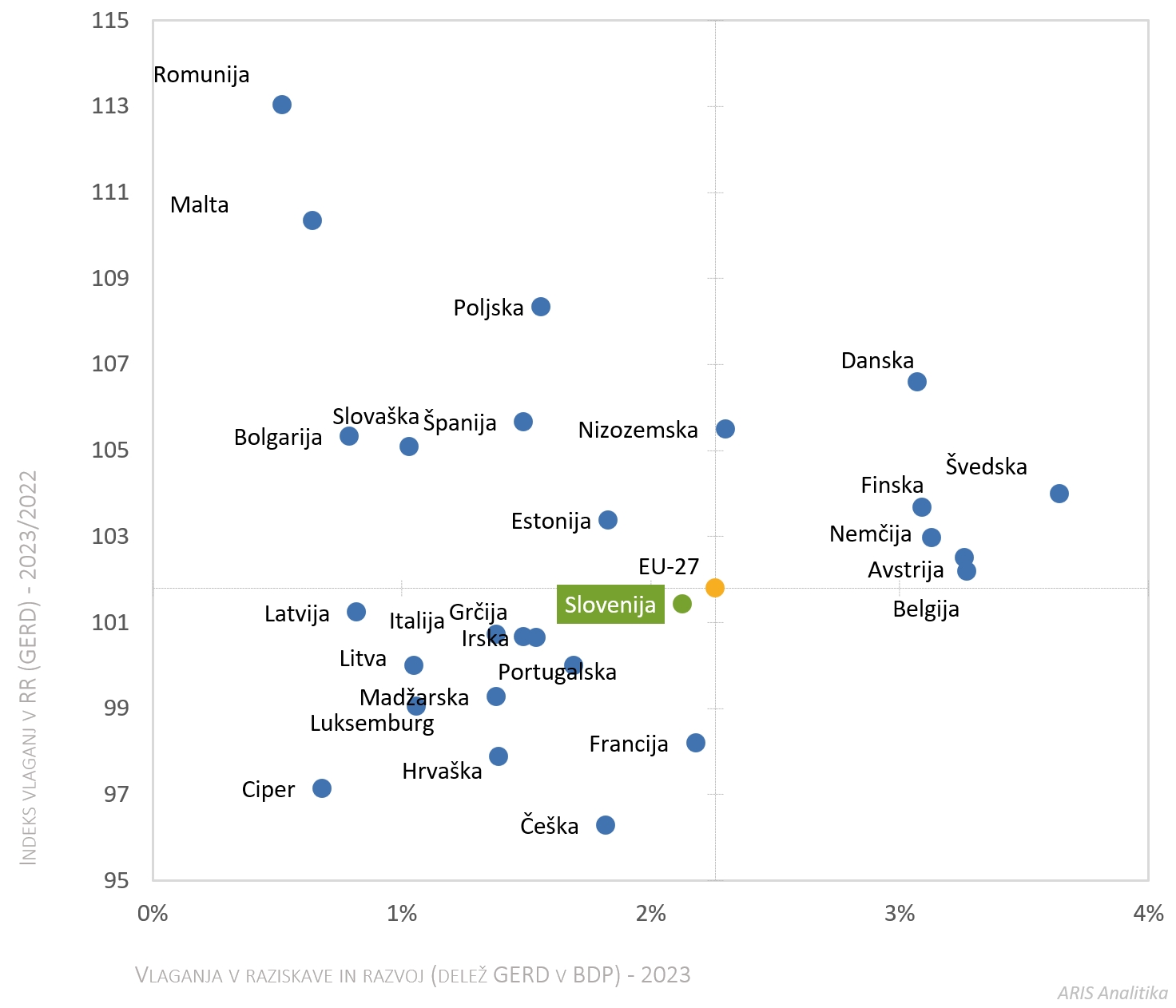 Vlaganja v raziskave in razvoj (delež GERD v BDP) Indeks (2023/2022)