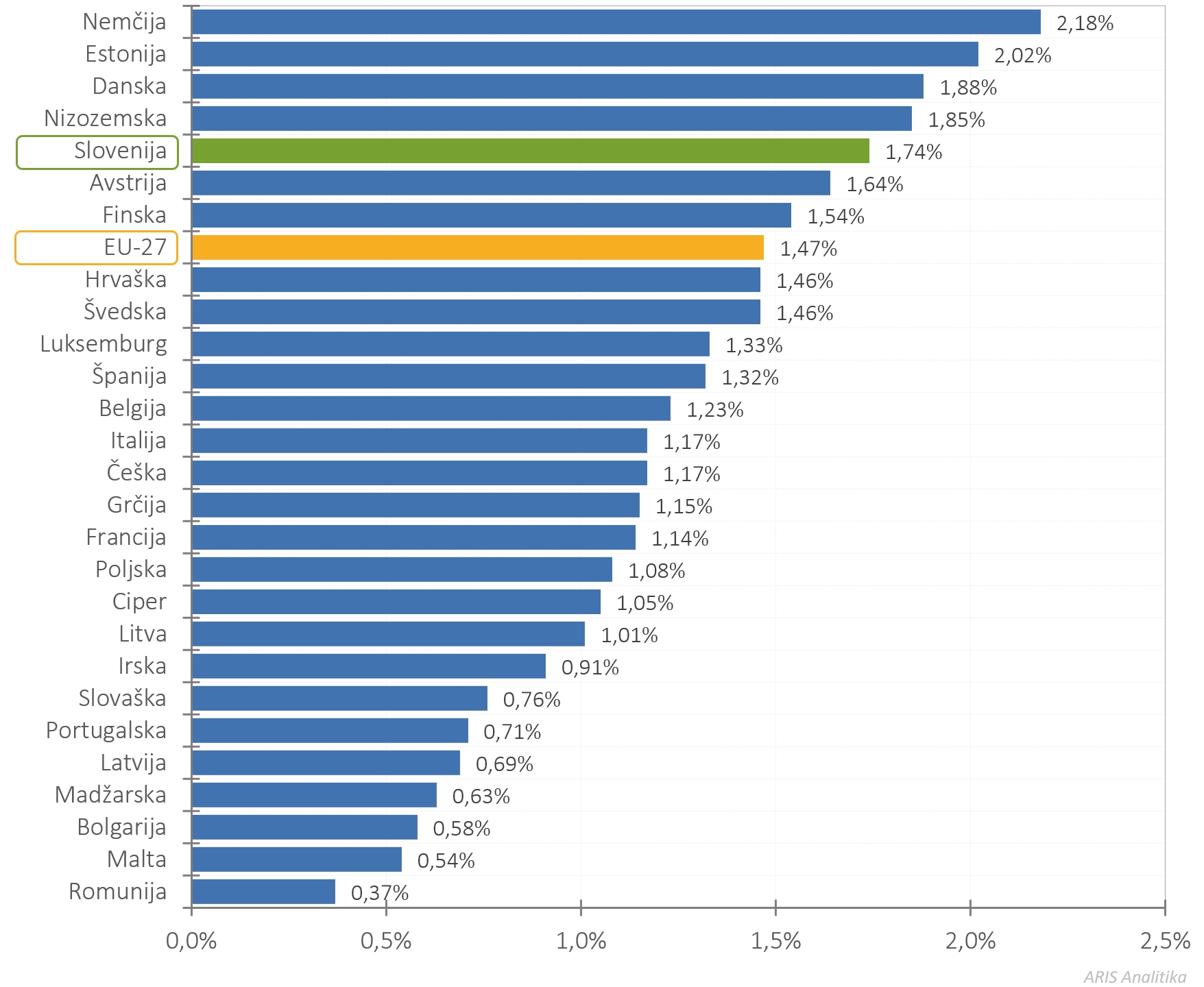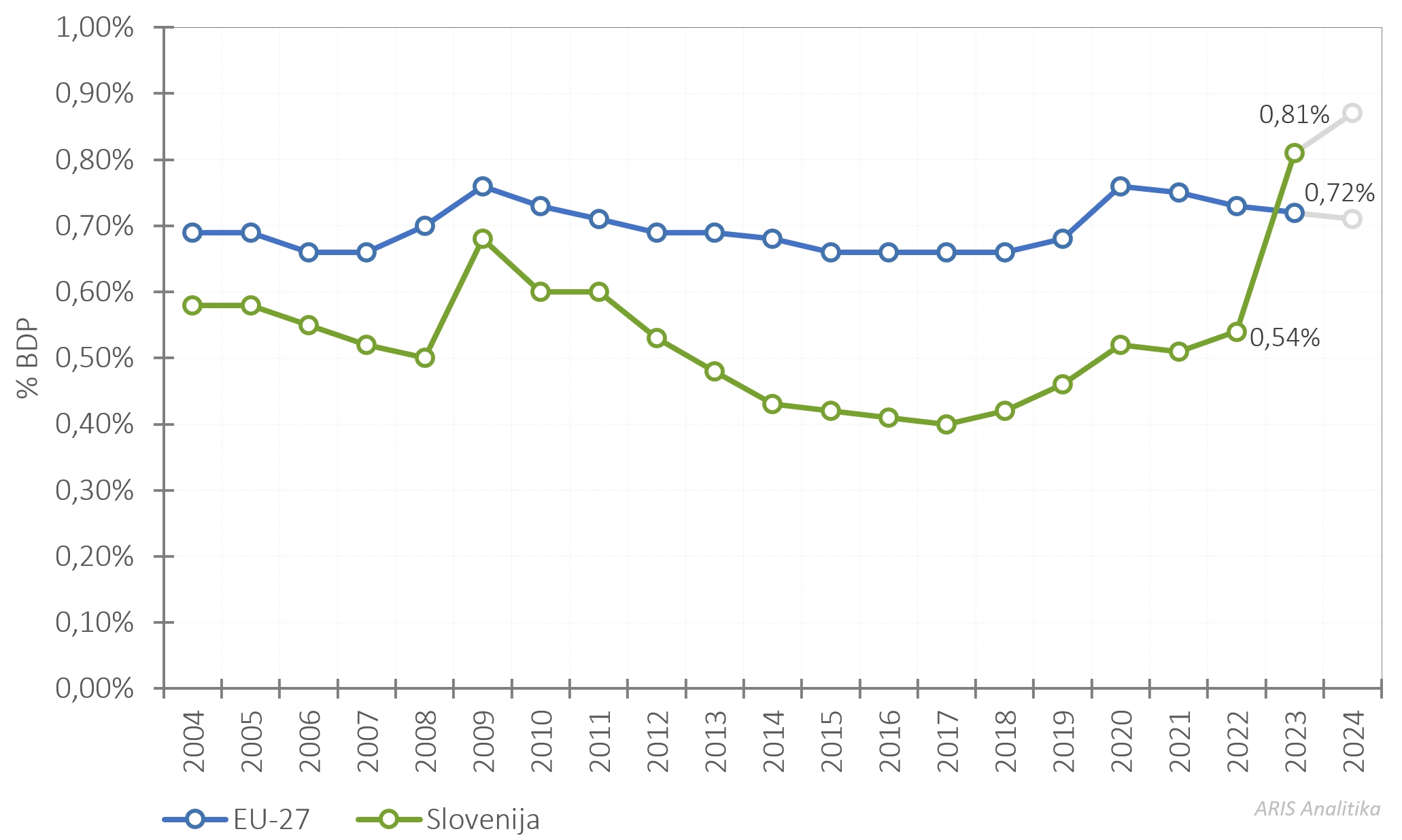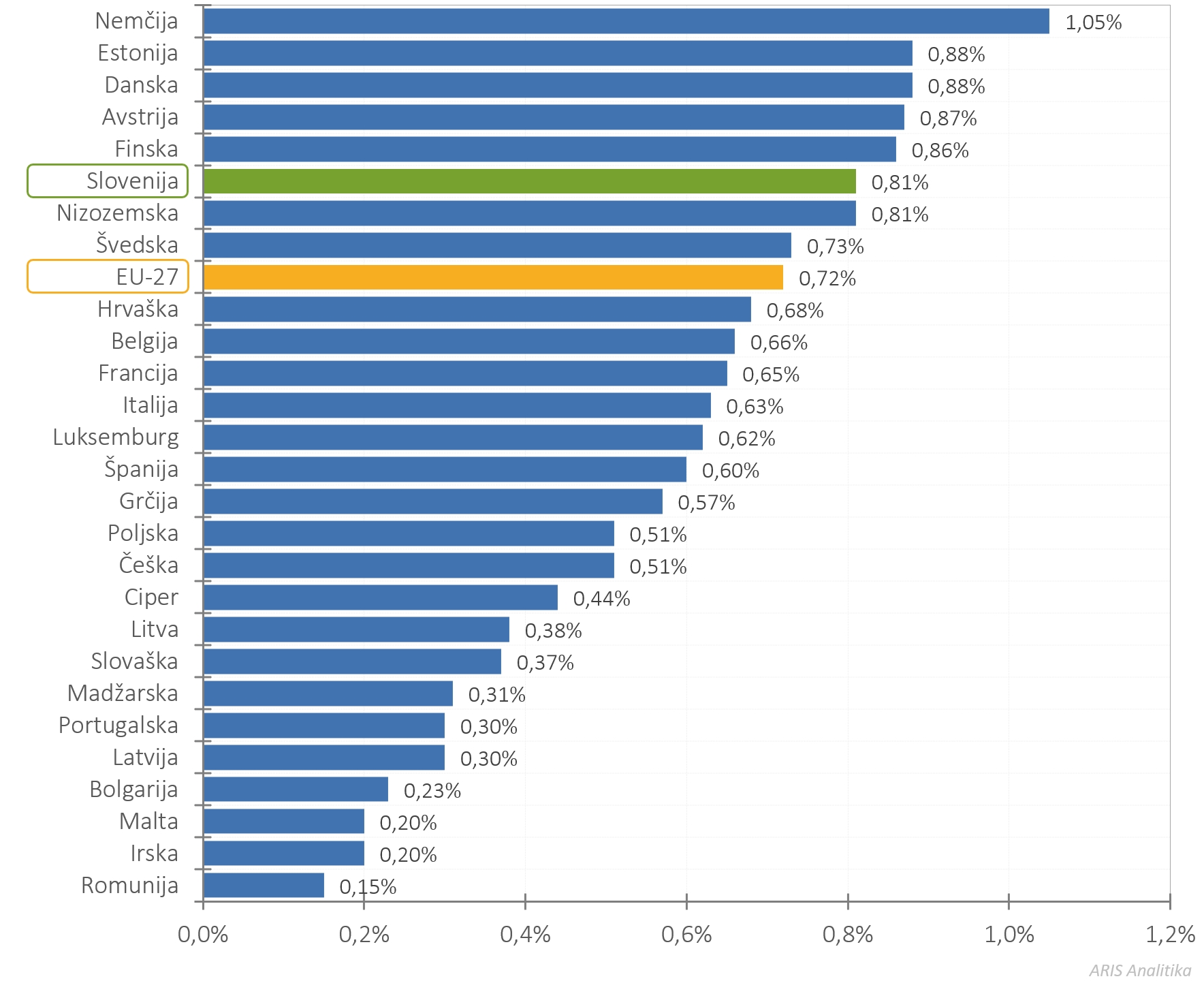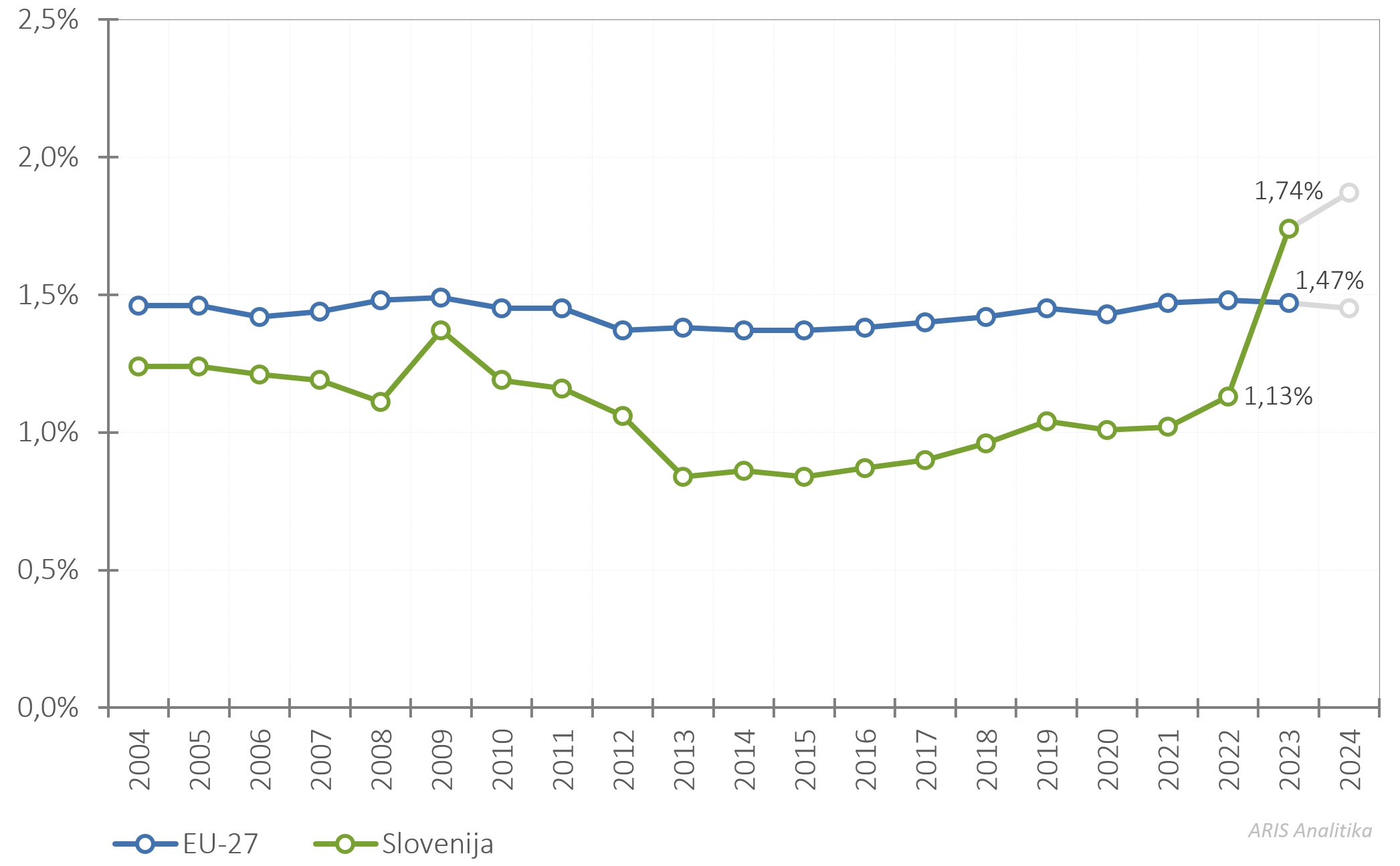 Državna proračunska sredstva za RRD v % od BDP v letu 2023